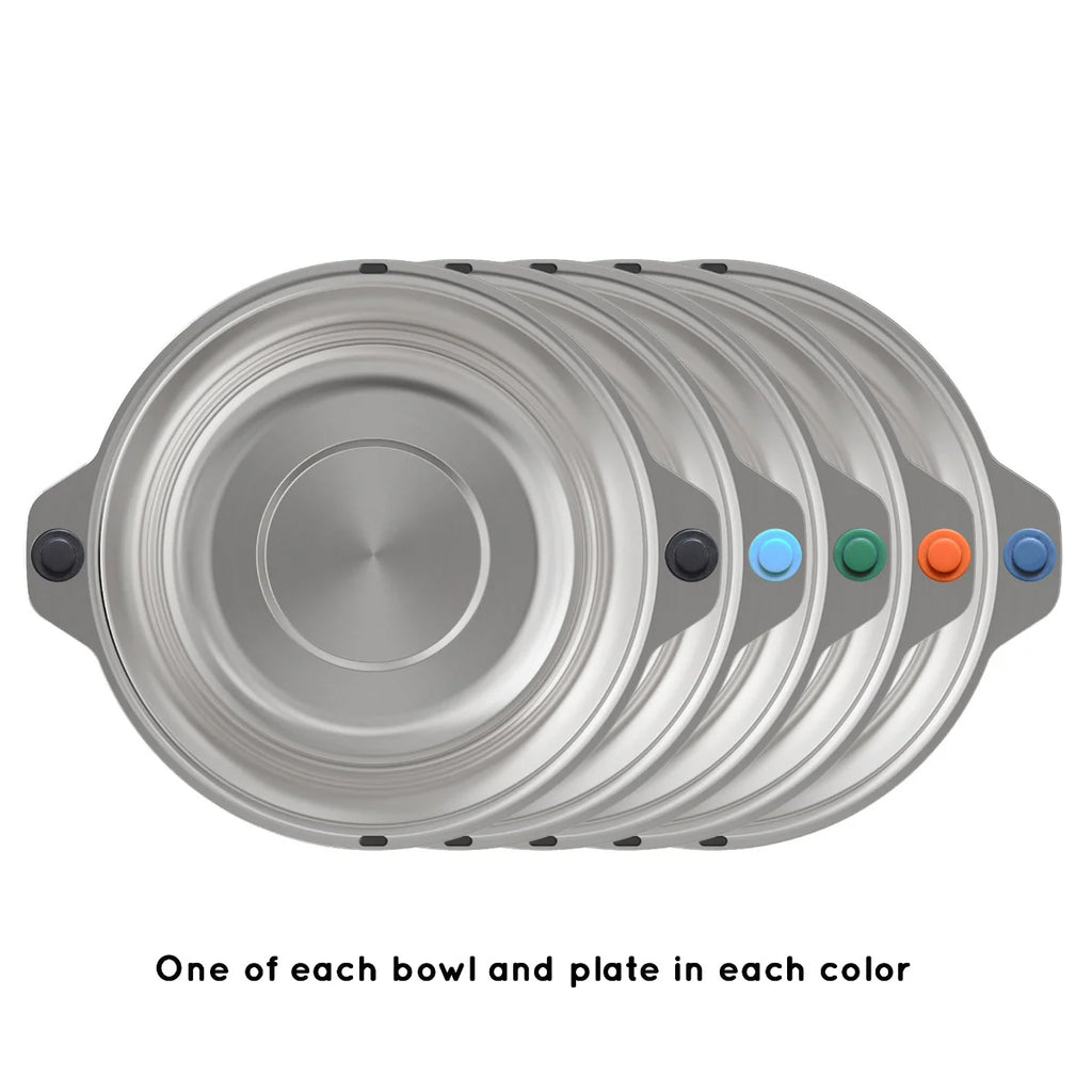 Featuring our patent-pending magnetic attachment points. This allows all the plates and bowls to stack magnetically together in a tidy and organized manner. You can stack as many sets together as you want. Our Magware Magnetic Cutlery can also be attached to the side of both bowls and plates, keeping it away from unhygienic surfaces and making it easy to carry.